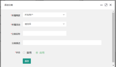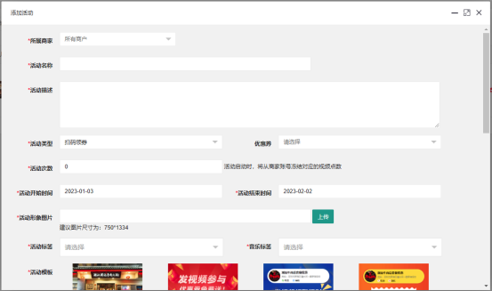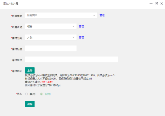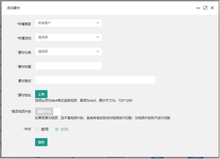 和素材分組一樣,系統中所有素材都是以活動為基礎的,在添加素材時,需要選擇所屬商家、所屬活動。