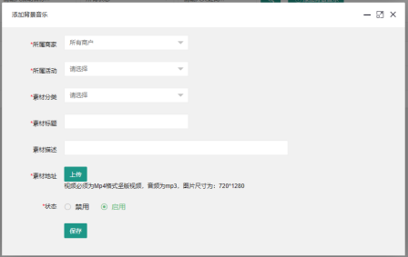 商家應盡可能多的上傳背景音樂,素材越多,混剪重復率就會越低。同樣,背景音樂也是以活動為基礎的,在添加素材時,需要選擇所屬商家、所屬活動。