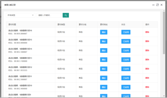 視頻素材即商家活動中所有視頻素材列表。在系統中,視頻素材分為長視頻和視頻片段兩種,如果商家上傳的為長視頻,則系統會根據AI算法自動對長視頻進行折解,折解為若干個視頻片段并錄入系統中。