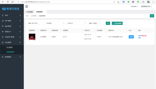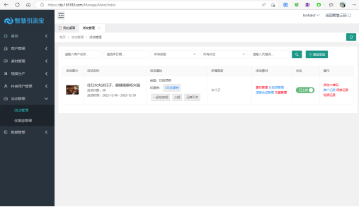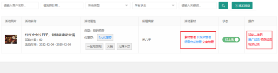 在活動列表頁,系統提供活動素材及活動記錄的快捷管理方式,點擊相應功能鏈接即可進行快速管理。