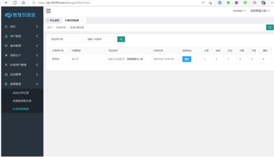 此處為所有活動視頻信息,包含視頻發布時間,視頻地址、分享數、轉發數、評論數、點贊數、下載數、播放數等數據信息。