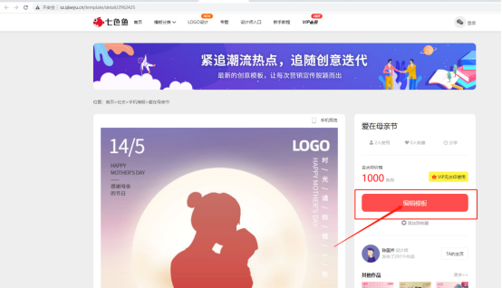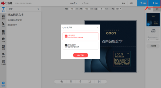 點擊下載后用戶可以自行選擇JPG或PNG格式下載到自己電腦上,便于網絡 傳播使用。需要注意,如果未購買當前模板,下載的文件將會出現七色魚水印。
