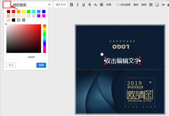 在畫布中選中文字元素后,點擊頂部工具條的顏色塊,會出現顏色選擇器,點擊所 需的顏色,然后點擊選擇確認即可