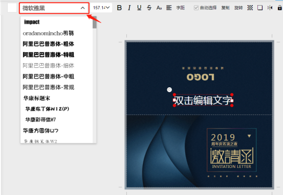 在畫布中選中文字元素后,點擊頂部工具條的字體下拉菜單,從其中選擇所需字體點擊即可