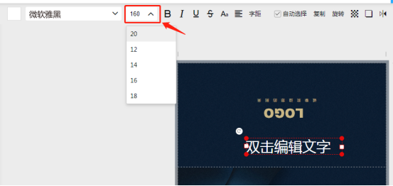在畫布中選中文字元素后,點擊頂部工具條的文字大小框,該框支持下拉快捷選擇 以及直接輸入數值修改