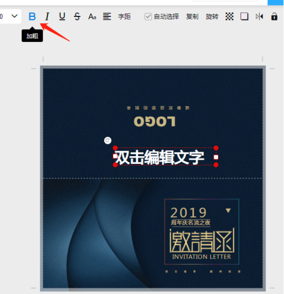 在畫布中選中文字元素后,點擊頂部工具條的加粗按鈕(見下圖)即可切換是否加 粗狀態