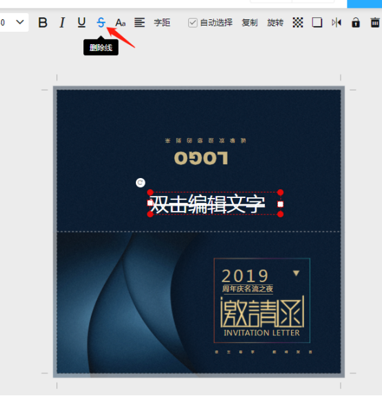 在畫布中選中文字元素后,點擊頂部工具條的刪除線按鈕(見下圖)即可切換是否 出現刪除線狀態