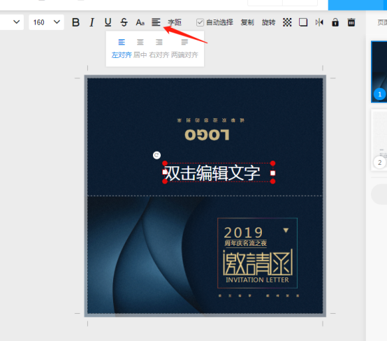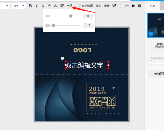在畫布中選中文字元素后,點擊頂部工具條的字距按鈕(見下圖),拖動(或輸入 數值)即可修改文字間距。多行文字的情況下可以修改行間距