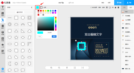 每一個形狀均可修改其內部的填充色,選中形狀元素后,點擊頂部工具條的色塊(見下圖), 即可喚出顏色選擇器,選中所需顏色后點擊選擇按鈕即可