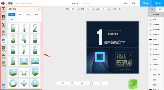 用戶可以通過雙擊容器元素進入容器編輯模式,該模式下可以縮放、拖拽改變容器內圖片元素的大小,位置,以便用戶制作出更加個性化的設計