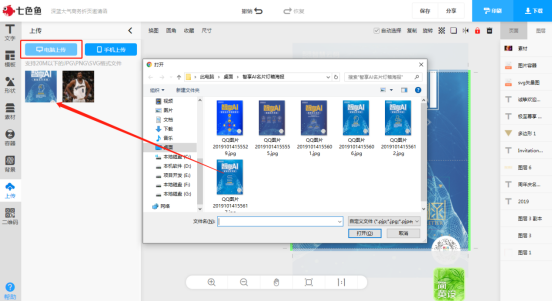 點擊《電腦上傳》按鈕即可將電腦中的圖片文件上傳到當前模板素材庫中,此處上 傳與素材庫中的上傳的區別在于,本功能上傳的素材僅會在當前設計中出現,一般 用于非常用或僅用于當前設計的素材