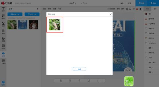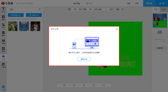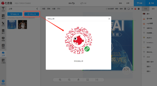 點擊《手機上傳》按鈕會自動彈出一個小程序碼,用戶使用微信掃描后即可在微信上將手機中的圖片上傳到當前設計中,便于用戶在PC和手機之間同步素材。