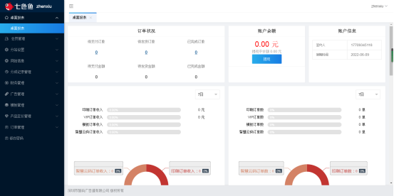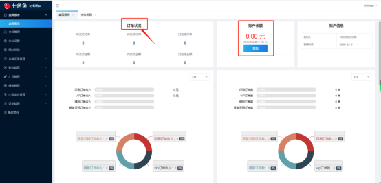 此處可查看訂單情況,賬戶余額,每日訂單情況,訂單來源占比,對管理賬號情況一目了然,如下圖