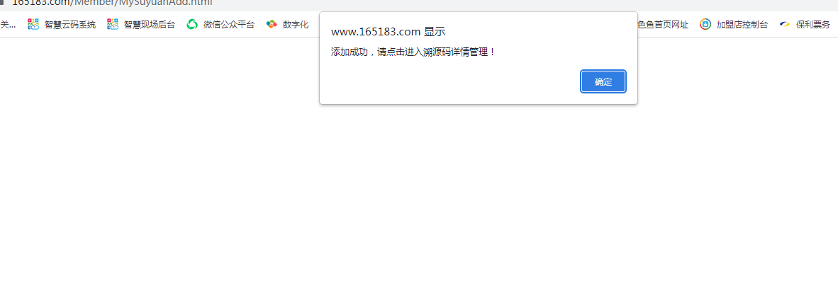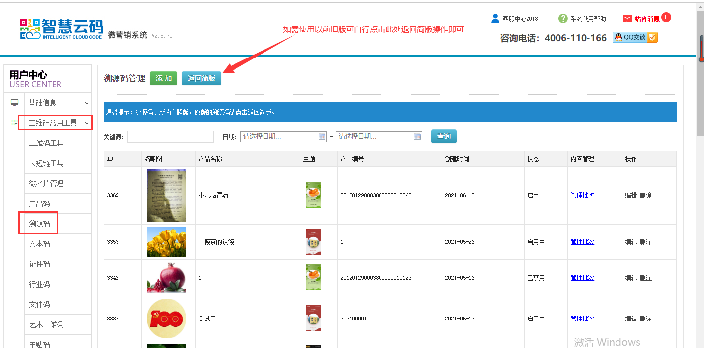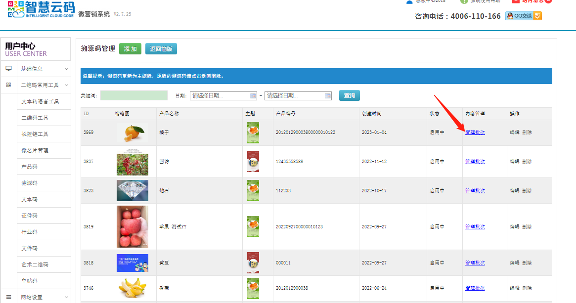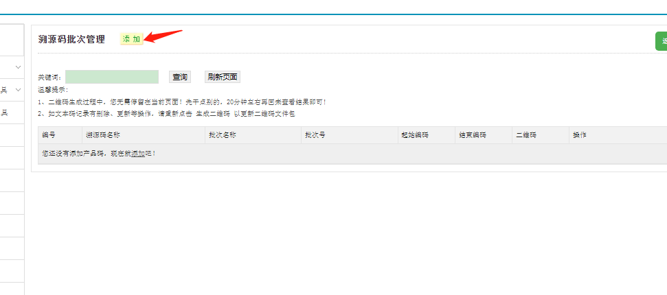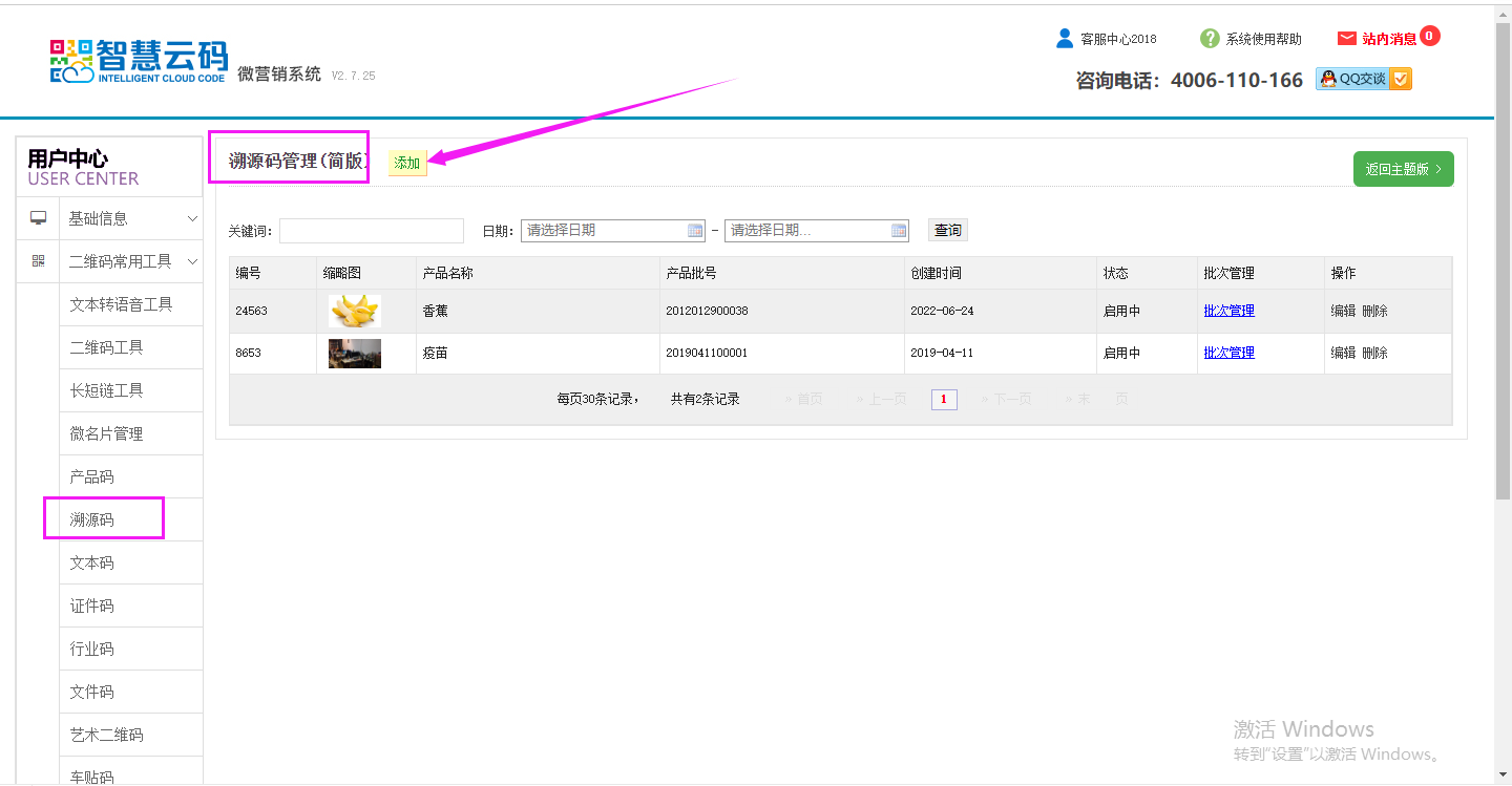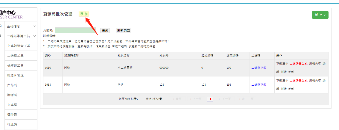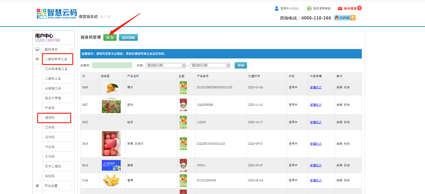 第一步:登錄智慧云碼系統后臺,找到左側第二個欄目,二維碼常用工具,點擊溯源碼,點擊添加。如下圖所示: