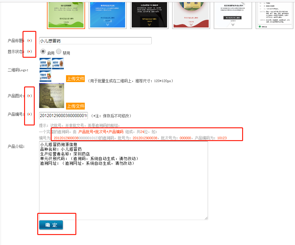 第二步:選擇模板,產品標題按實際情況如實填寫;顯示狀態選擇啟用;LOGO圖片尺寸120*120x產品圖片推薦尺寸為430*430X,格式JPG/PNG;產品編號提示:這批號,并非批文號,而是追溯碼的前綴,一個完整的追溯碼,由 產品批號+批次號+產品編碼 組成,共24位,如:編號為:201201290003800000010123的追溯碼,批號為:2012012900038,批次號為:000000,產品編碼為:10123