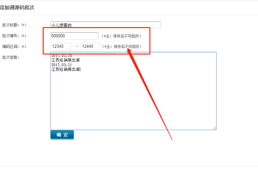 第三步:批次標題建議填寫產品名稱;以溯源碼201806080001100000012345為例,則批次編號應填寫000000,始編碼區間填寫12345,若此次要生成100個產品的溯源碼,那么編碼區間應填寫12345-12445,如下圖所示: