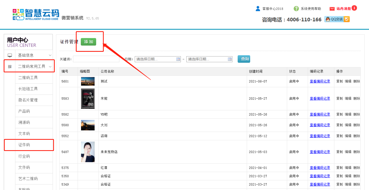 第一步:首先登錄智慧云碼進(jìn)入管理,點(diǎn)擊左側(cè)二維碼常用工具欄目,找到證件碼,點(diǎn)擊添加,如下圖所示: