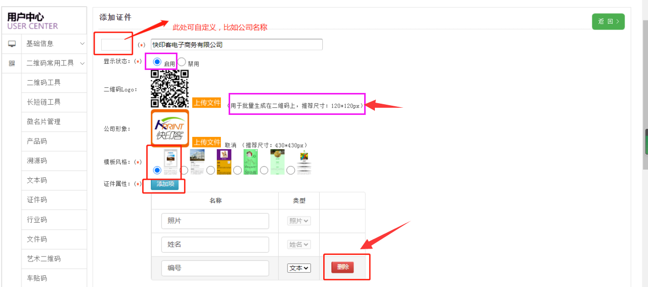 顯示狀態(tài)為啟用;公司形象為公司LOGO,推薦尺寸為430*430px,格式為JPG/PNG(若該證件碼對象為動(dòng)植物,上傳動(dòng)植物照片即可);模板風(fēng)格按自身需求選擇(若該證件碼對象為人,建議選擇第一個(gè)風(fēng)格模板);證件碼屬性除了照片和姓名無法改動(dòng)外,其他項(xiàng)可調(diào)整,比如添加項(xiàng)目或刪除項(xiàng)目,如下圖所示: