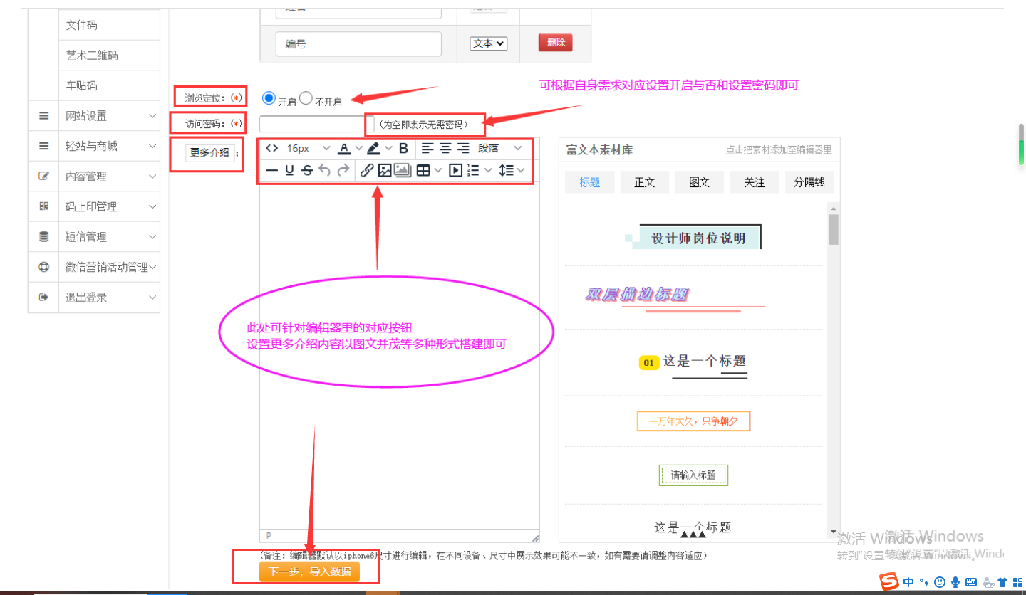 第三步:瀏覽定位可根據(jù)自身情況選擇開啟與否;訪問密碼也是自行輸入設(shè)置即可,為空即表示無需密碼;更多介紹處可詳細(xì)填寫好相關(guān)內(nèi)容,可植入文字、圖文、音樂、視頻、設(shè)置超鏈接等等,右邊是素材庫,可以根據(jù)情況自由選擇模板或者圖文填充,錄入完畢好,點(diǎn)擊下一步導(dǎo)入數(shù)據(jù)即可,如下圖所示: