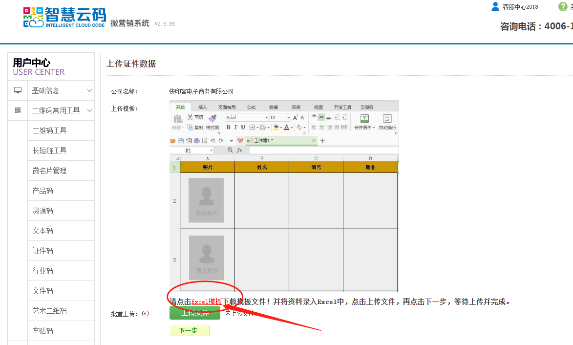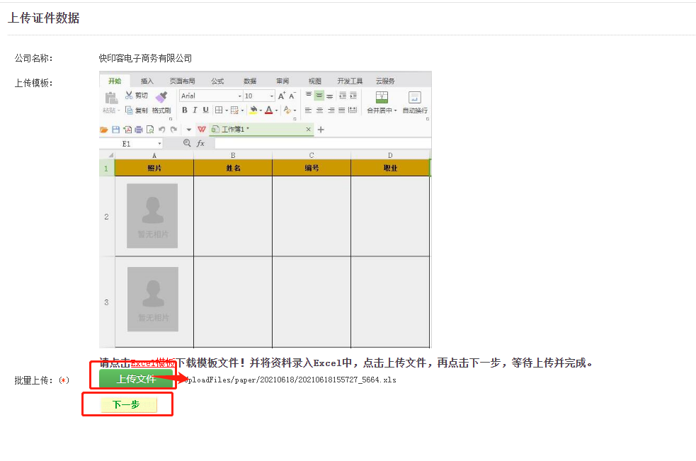 第六步:點(diǎn)擊上傳文件,把剛才完善好信息的表格上傳,上傳完畢后,點(diǎn)擊下一步,如下圖所示:
