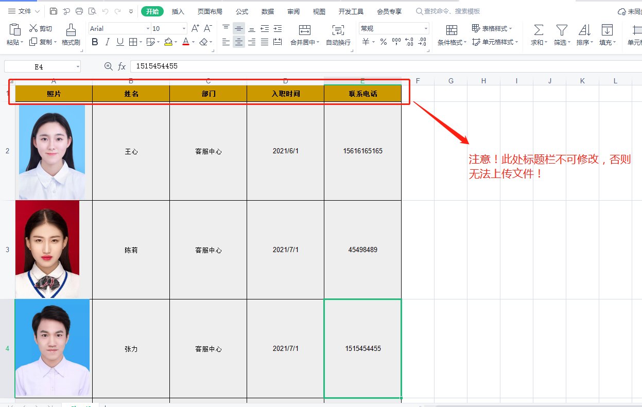 第五步:打開下載的表格,完善相關(guān)資料。照片插入表格后,需要手動(dòng)拉大單元格大小,調(diào)小照片尺寸;需要注意的是,此處標(biāo)題欄與第二步的證件屬性欄相對應(yīng),第二步添加了多少項(xiàng)目,名稱是什么,則下載的表格里的欄目就對應(yīng)的是所添加的項(xiàng)目和名稱,不可以修改,否則無法上傳文件!
