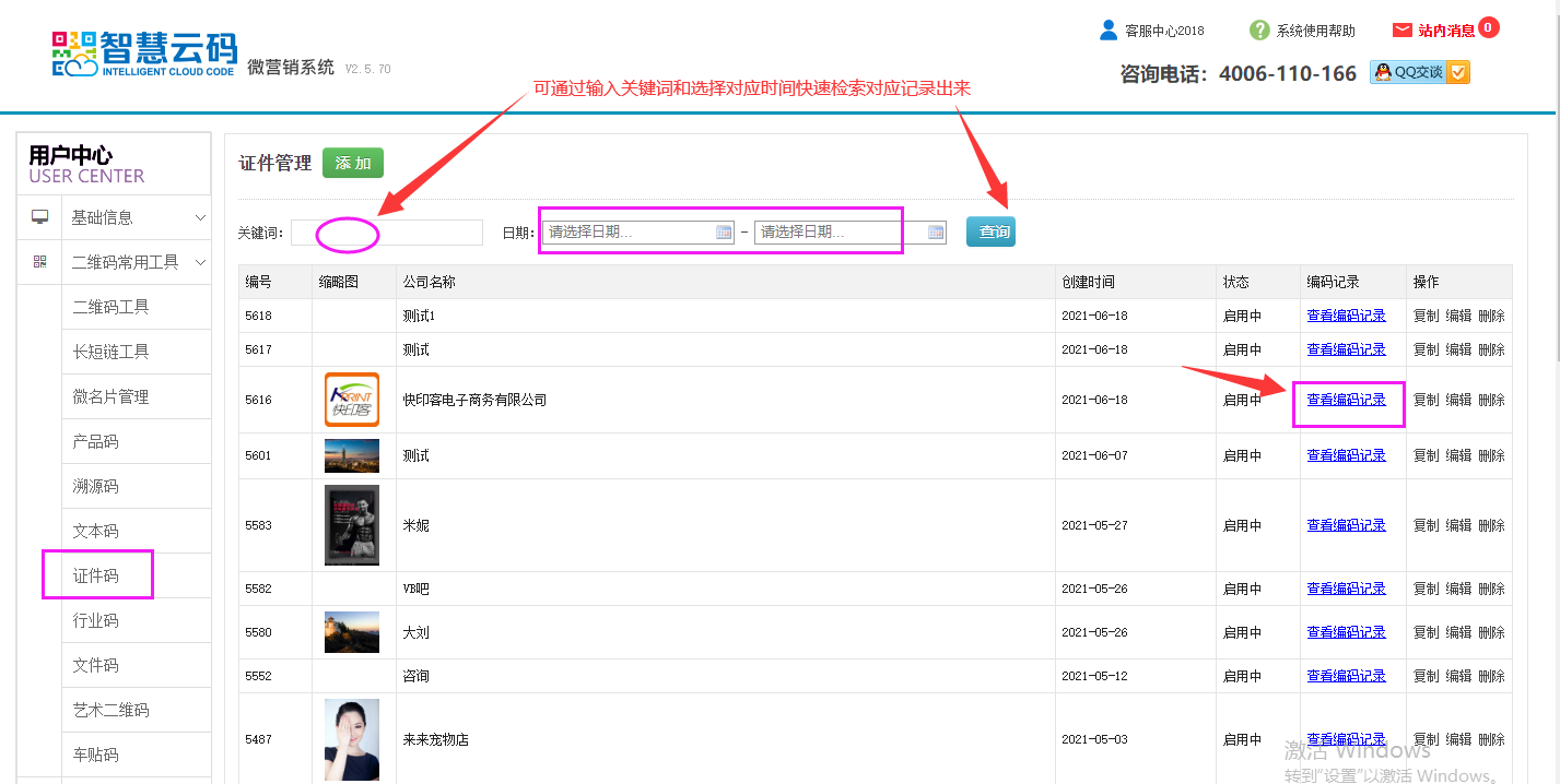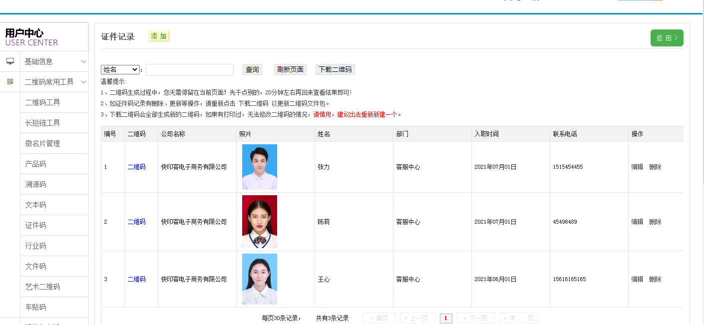 第七步:上傳完成后,在證件編碼記錄中,可查看詳情編碼信息,可批量下載二維碼,用于印刷等,也可以直接掃碼瀏覽證件詳情或修改,如下圖所示:
