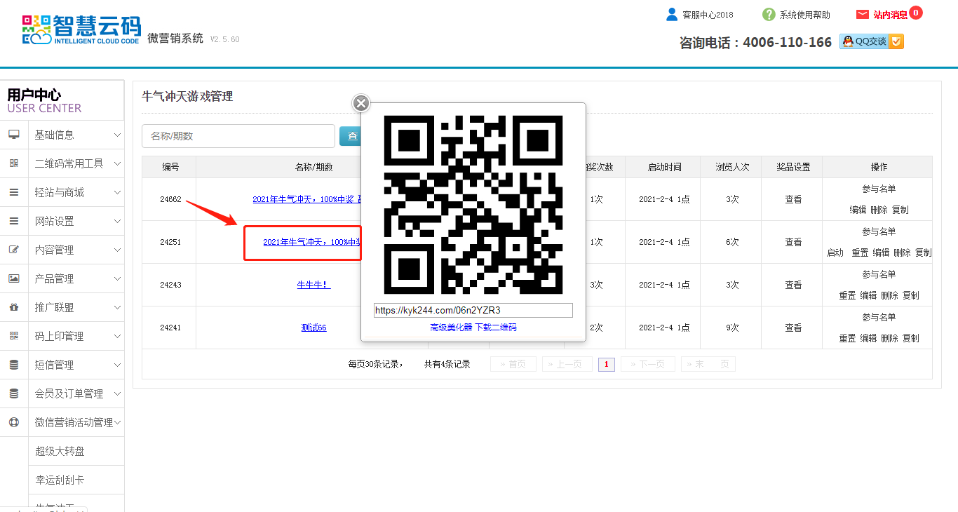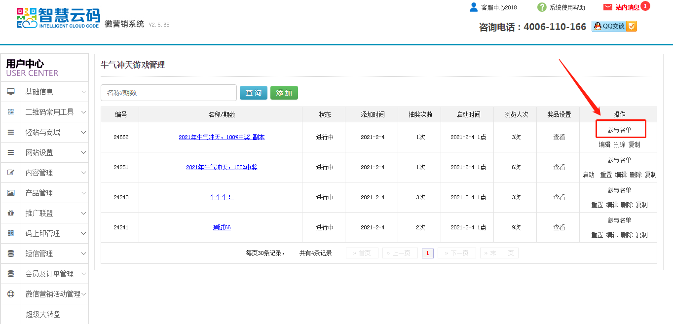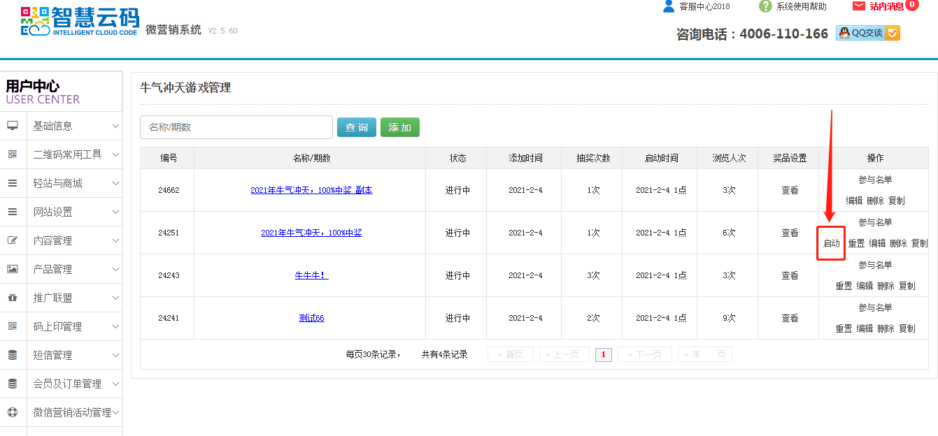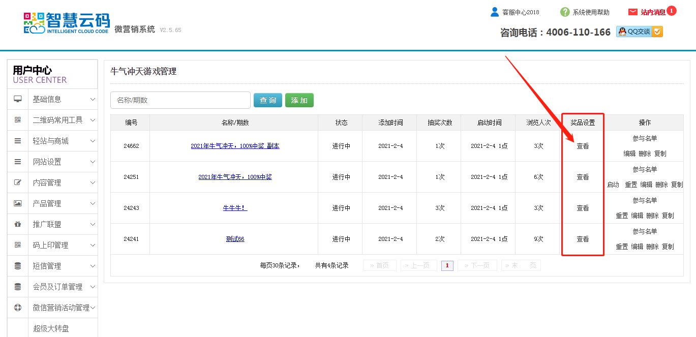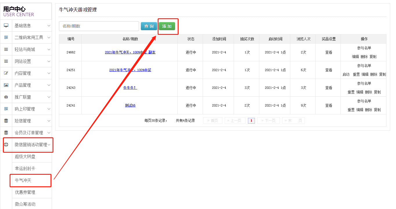 1.位置:登錄智慧云碼,點擊微信營銷活動管理-牛氣沖天-添加