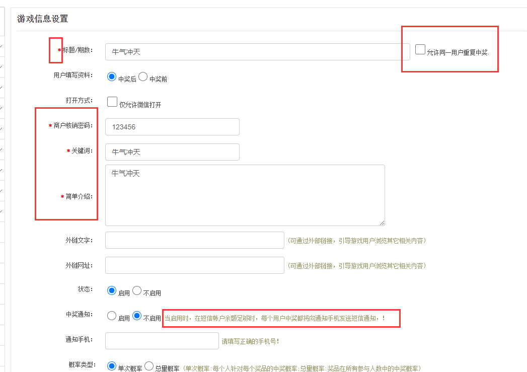 中獎通知和通知手機即有人參與并中獎后,會發送相關短信通知在活動方手機上(前提需要先充值短信才可以)