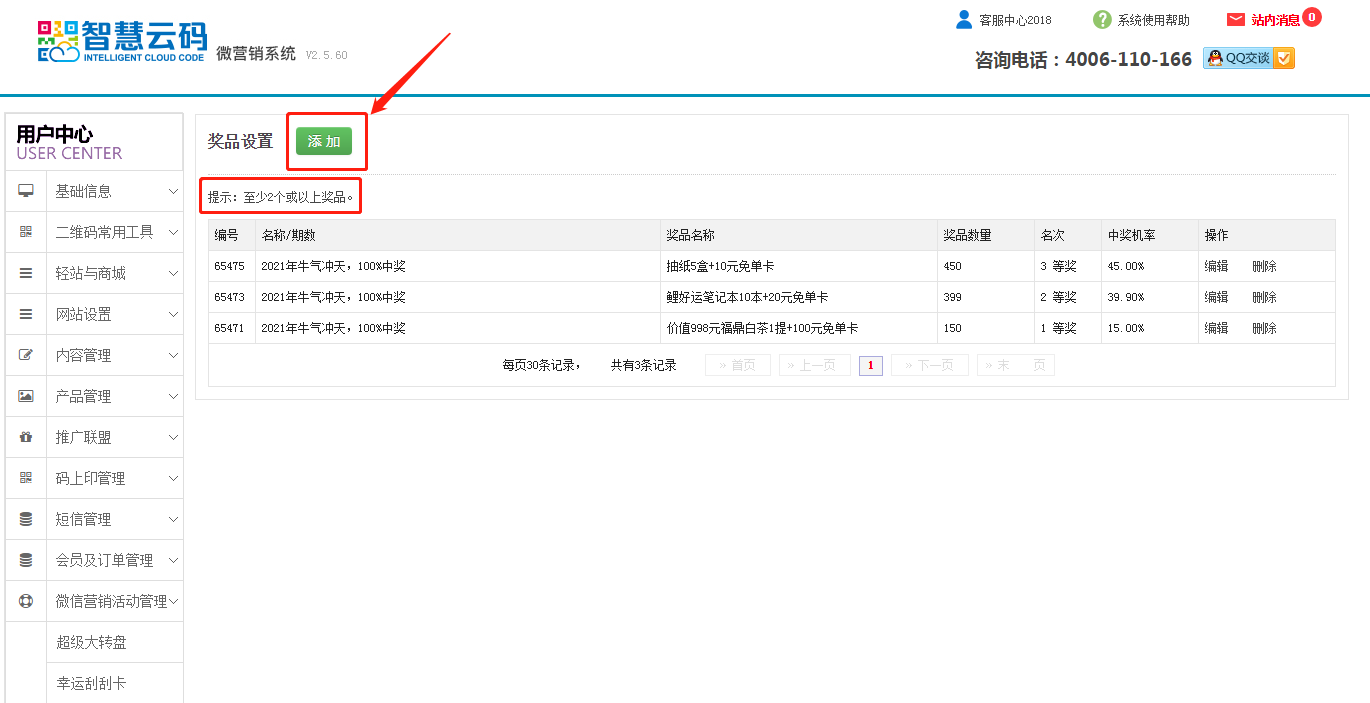 4.獎品設置,點擊獎品設置查看-添加(至少要2個或2個以上的獎項)