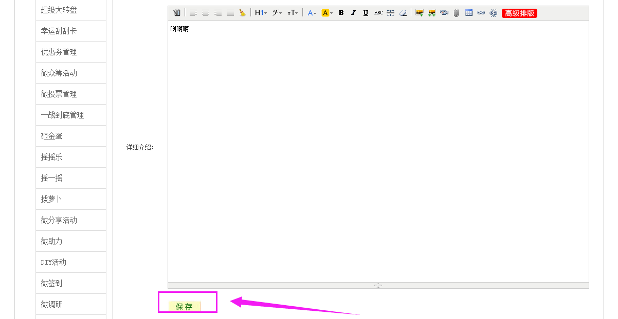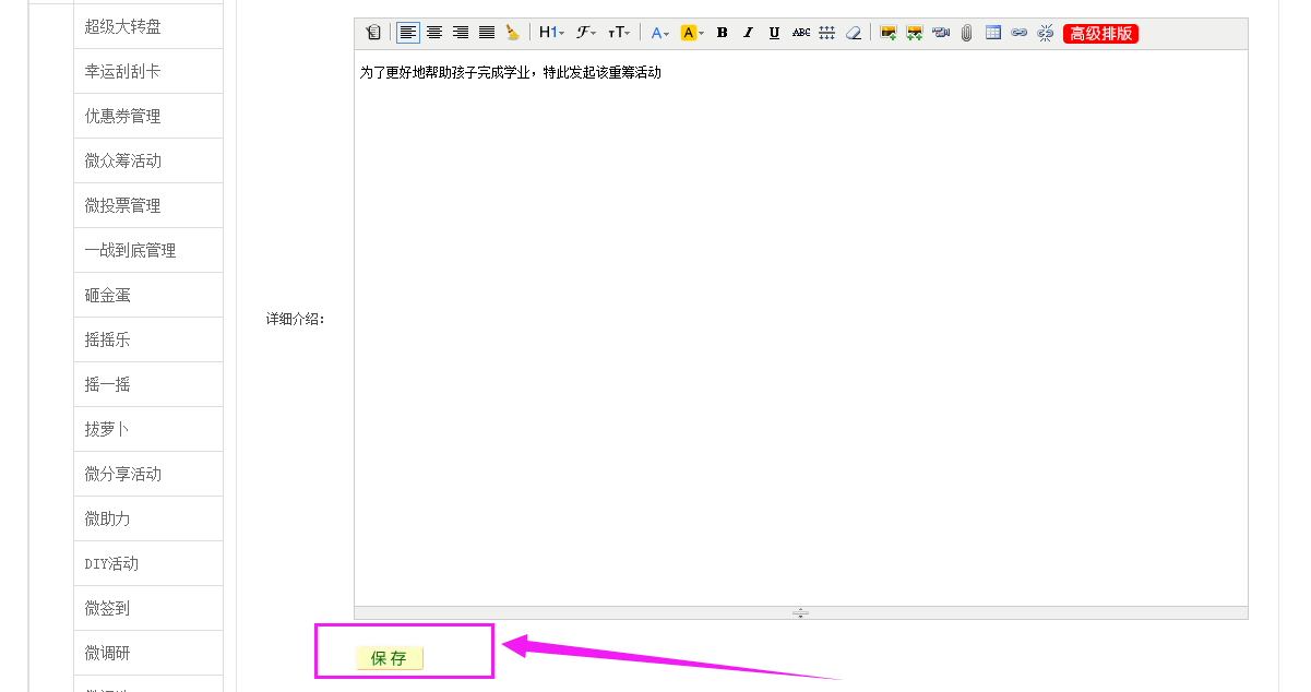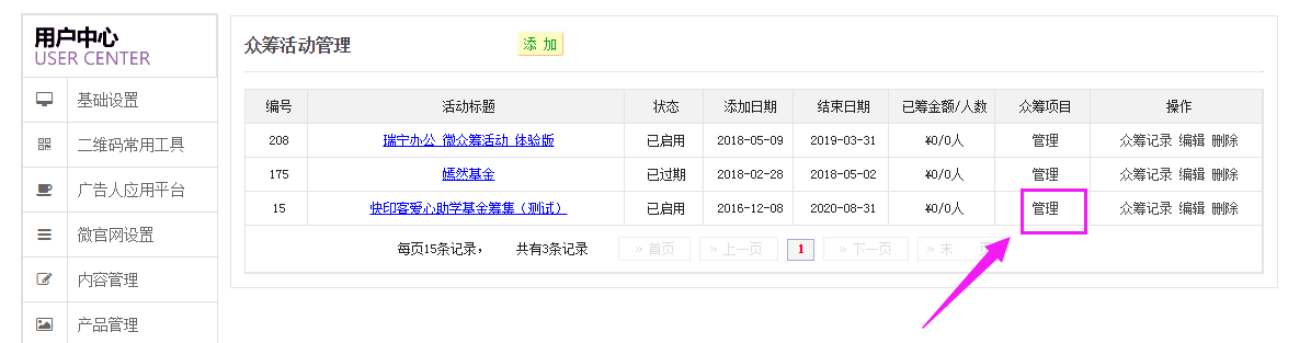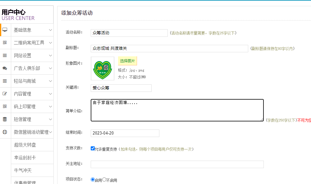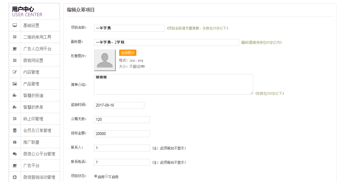 3、點擊保存之后,返回眾籌活動管理列表,點擊“管理”;項目名稱按照實際情況填寫,請盡量簡要,字?jǐn)?shù)在25字以下;副標(biāo)題按實際情況填寫,盡量保持在25字以內(nèi);形象圖片格式為JPG/PNG,尺寸無要求,大小不超過2MB;簡單介紹按實際情況填寫,字?jǐn)?shù)在250字以下;起始時間、眾籌天數(shù)(不能大于活動結(jié)束的時間)、目標(biāo)金額、聯(lián)系人、聯(lián)系電話按實際情況填寫;項目狀態(tài)選擇啟用;詳細(xì)介紹是對這個項目的詳細(xì)介紹。最后點擊保存即可。如下圖所示: