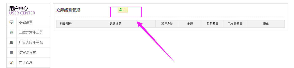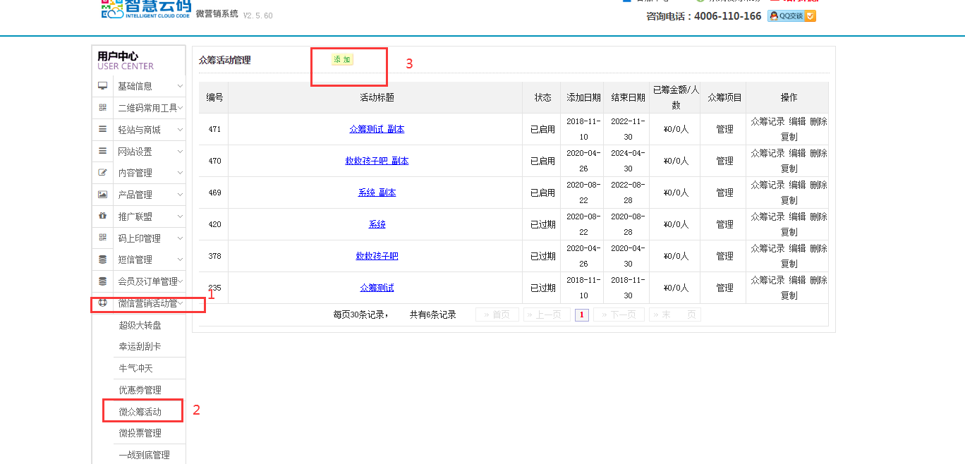 1、登錄智慧云碼微營銷系統(tǒng),找到微信營銷活動管理欄目,點擊微眾籌活動,點擊添加,如下圖所示: