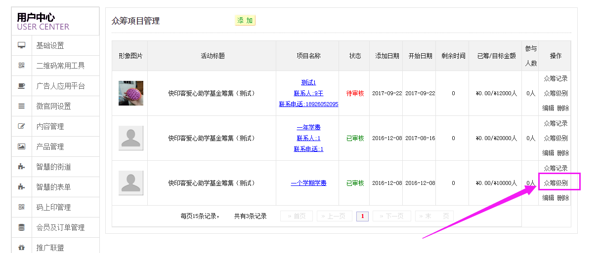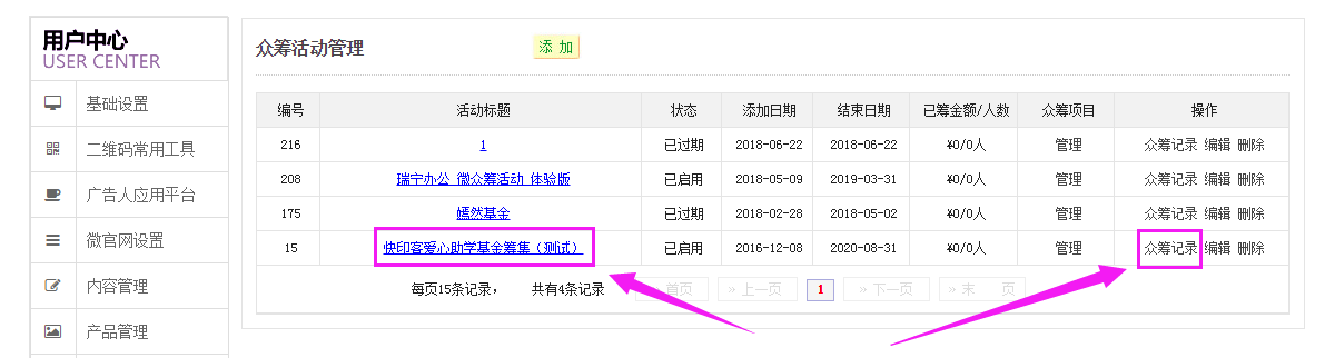 設(shè)置完成后,返回眾籌活動列表,點擊標(biāo)題可獲取二維碼,掃碼即可參與;點擊眾籌記錄可以了解該項目重籌情況。如下圖: