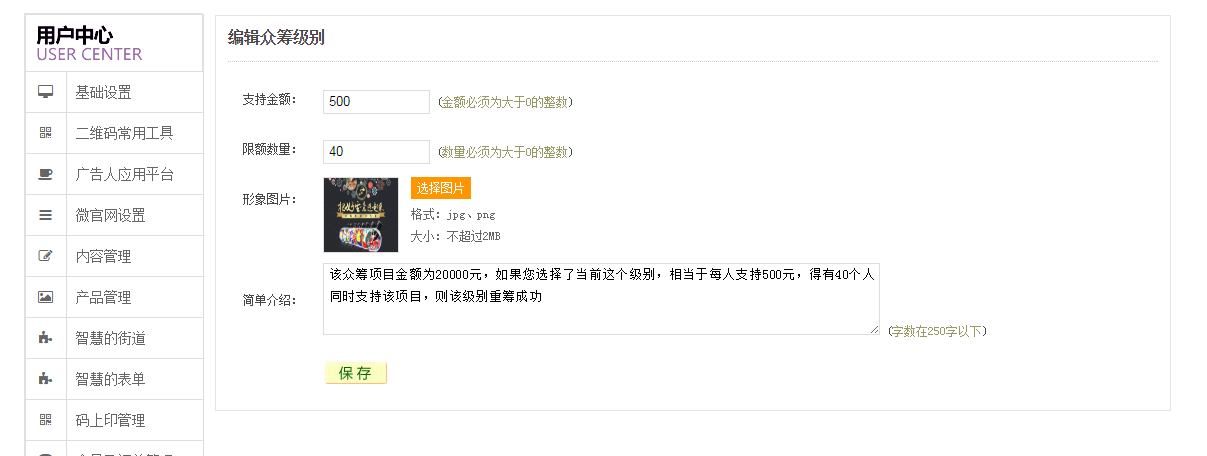 4、點擊該項目名下的眾籌級別,點擊添加。由于之前添加項目時,選擇該項目的金額為20000元,如果支持金額設(shè)置成500元,則限額數(shù)量為40;形象圖片格式為JPG/PNG,無尺寸要求,大小不超過2MB;簡單介紹是對該眾籌級別的詳細(xì)介紹。如下圖所示: