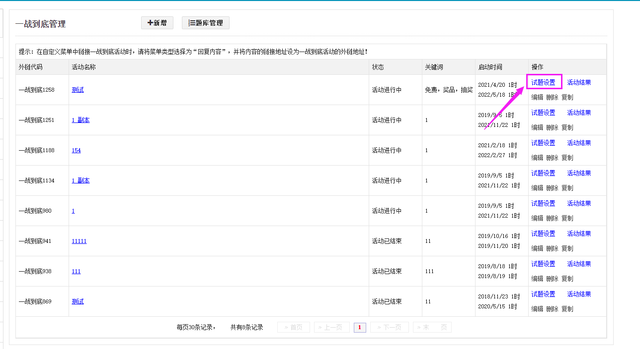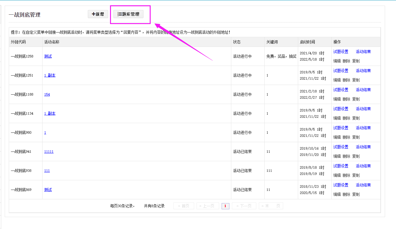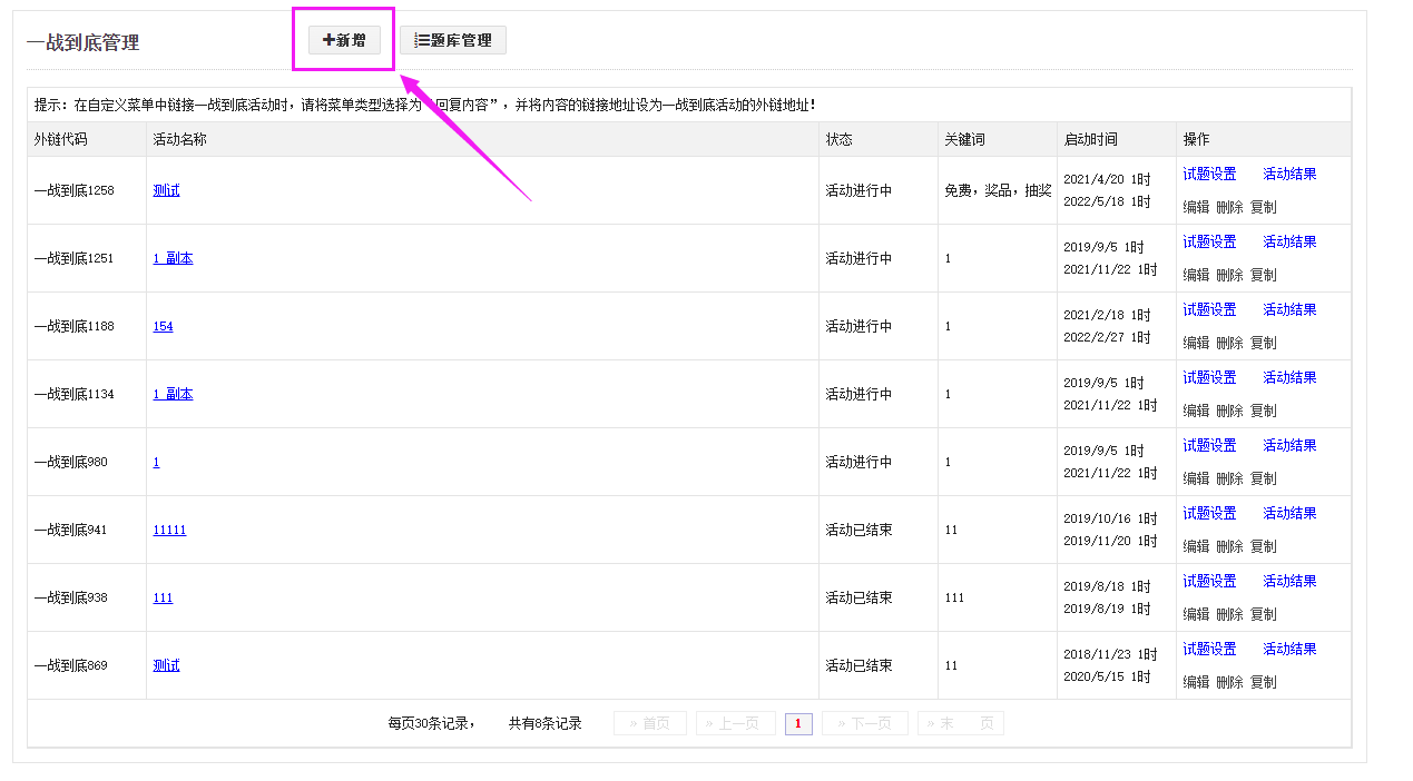4、題庫設(shè)置完畢后,返回一戰(zhàn)到底游戲列表,點擊新增,如下圖所示