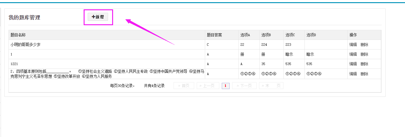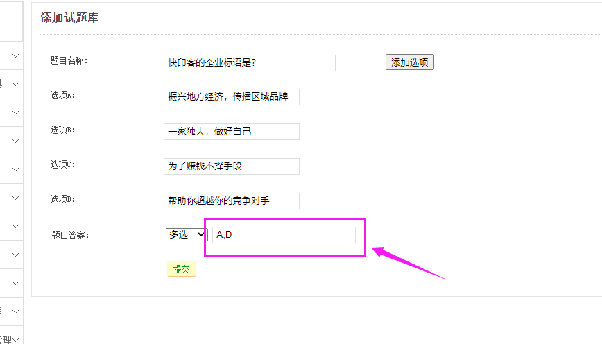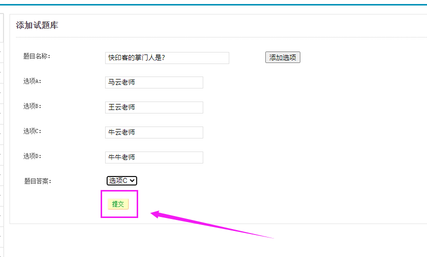 2、先點擊題庫管理去添加相關(guān)題庫,點擊新增題目名稱按實際情況填寫;選項A、選項B、選項C、選項D按實際情況填寫,題目答案為該題目的正確答案,按實際情況填寫。以上信息設(shè)置完畢后,點擊提交,如下圖所示
