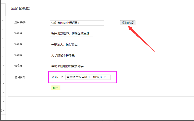 3、如果題庫當(dāng)中的題目存在ABCD以上的選項,可以直接點擊添加選項,題目答案是多個選項的話就需要選擇多選,答案用逗號隔開,如“A,B,C”.