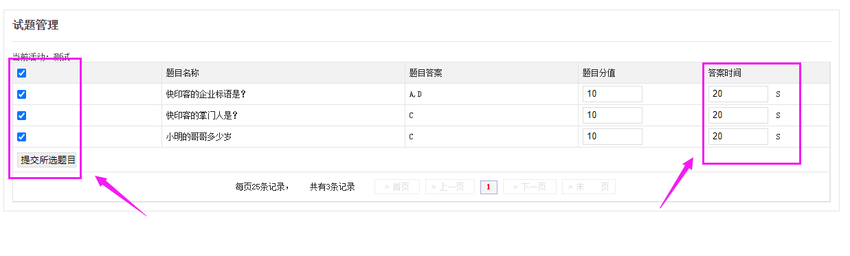 7、點擊試題設(shè)置,點擊新增題庫當(dāng)中選擇此次一戰(zhàn)到底的相關(guān)題目,可以多選,多選題目勾選后,點擊提交所選題目即可同時可以加入答案時間,如下圖所示