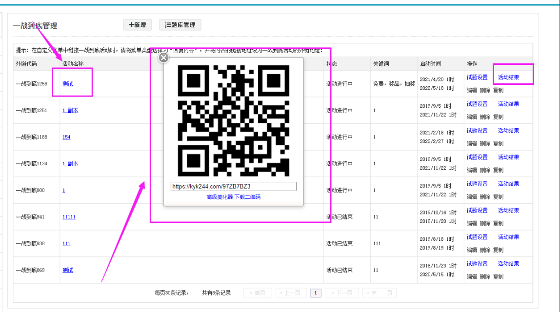 8、點擊活動名稱就是該活動的二維碼,可以掃碼查看;也可以直接復(fù)制二維碼下面的鏈接,點擊鏈接也可以查看。如果需要查看活動結(jié)果,點擊活動結(jié)果按鈕即可查看。如下圖所示