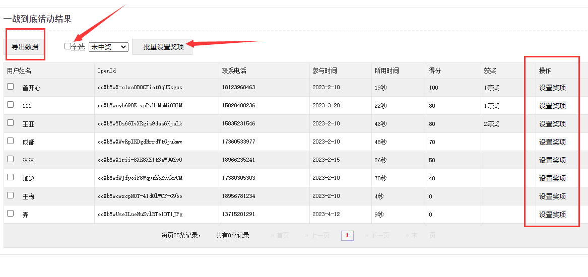 9、一站到底的活動結(jié)果可以根據(jù)客戶的答題時間和分?jǐn)?shù)去自定義設(shè)置獎項,可以單個設(shè)置也可以批量設(shè)置用戶獎項,也可以一鍵導(dǎo)出用戶數(shù)據(jù)。