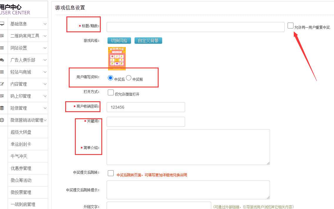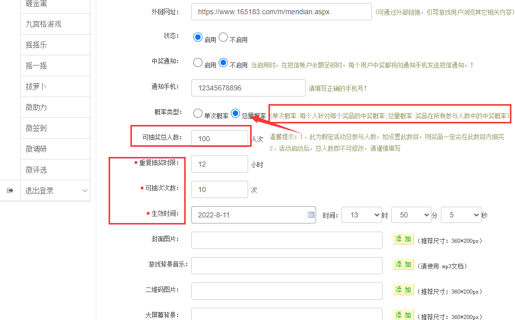 舉例:獎(jiǎng)品總數(shù)(1-6等獎(jiǎng))是500個(gè)。用戶想要控制在90%中獎(jiǎng)率,那我們就把500(獎(jiǎng)品總數(shù))除以0.9(中獎(jiǎng)概率)等于556.我們?cè)诳沙楠?jiǎng)總?cè)藬?shù)填寫(xiě)556人就好。以此類(lèi)推。如下圖所示: