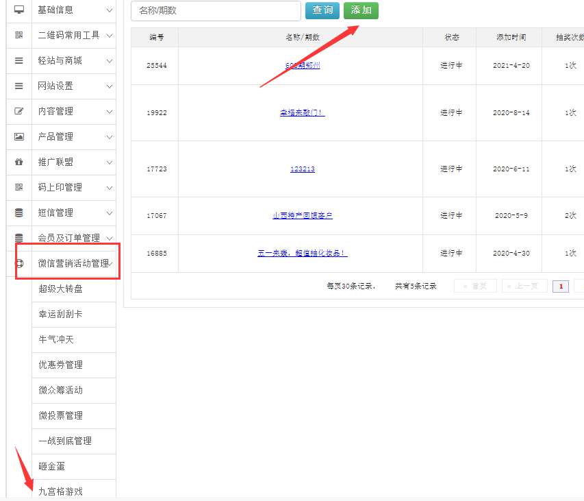其次,找到左邊板塊,點(diǎn)擊微信營(yíng)銷(xiāo)活動(dòng)管理,點(diǎn)擊九宮格游戲,點(diǎn)擊添加,如下圖所示: