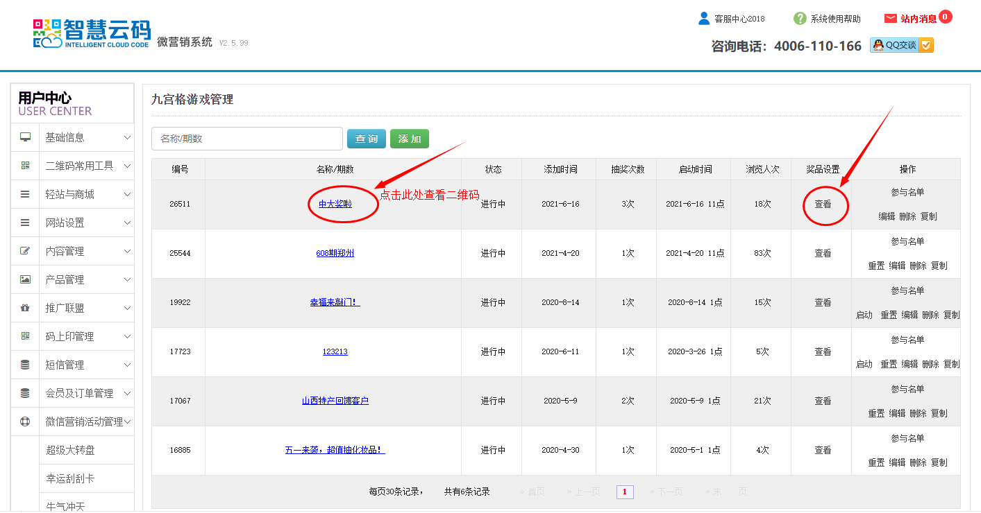 第六步:點(diǎn)擊名稱/期數(shù)可查看該游戲記錄二維碼,點(diǎn)擊獎(jiǎng)品設(shè)置下面的查看,便可添加相應(yīng)獎(jiǎng)品,點(diǎn)添加后,按照里面相對(duì)應(yīng)信息填寫(xiě)完整;如下圖所示: