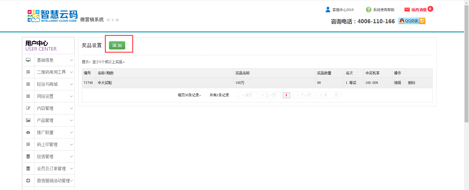 首先,登錄系統(tǒng)后臺(tái),點(diǎn)擊智慧云碼進(jìn)入,如下圖所示:
