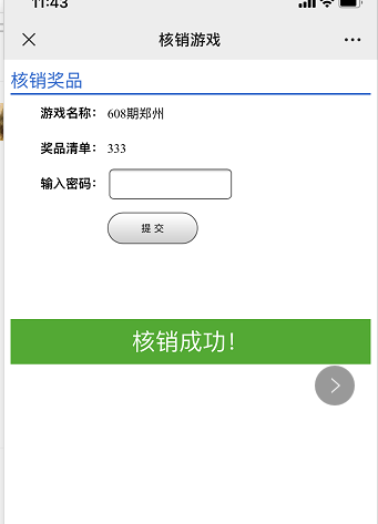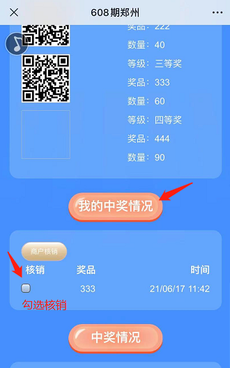 第七步:一旦全部設(shè)置好后,用戶便可掃碼參與,一旦中獎(jiǎng)后可到店領(lǐng)取獎(jiǎng)品,用戶再掃一下二維碼,往下拉看我的中獎(jiǎng)情況即可進(jìn)行核銷(xiāo)兌獎(jiǎng)!如下圖所示: