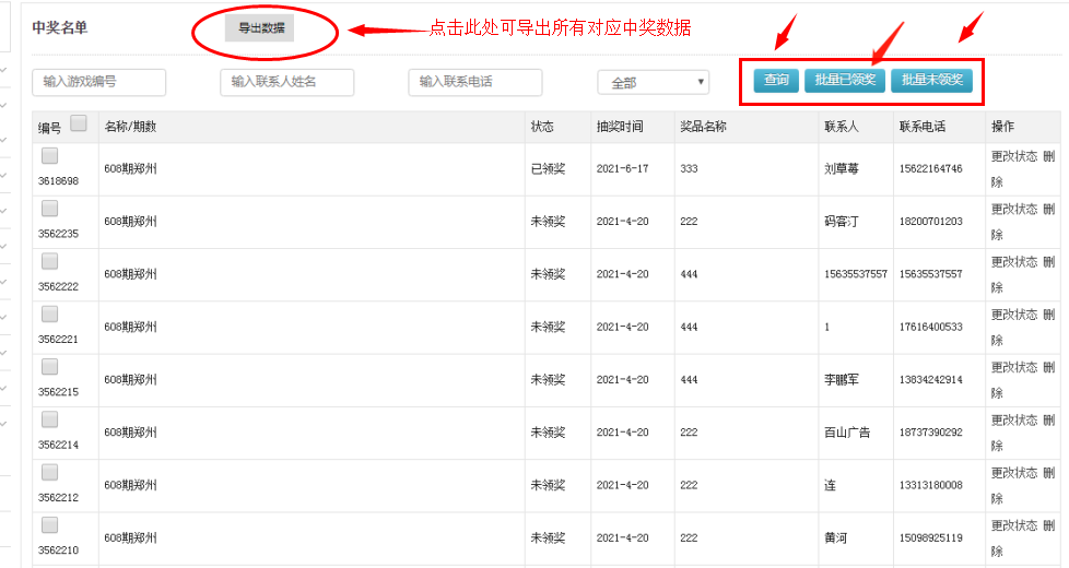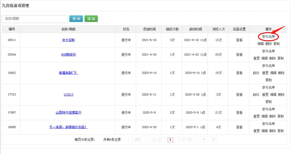 第八步:點(diǎn)擊操作下面的參與名單,便可看用戶參與情況跟獎(jiǎng)品領(lǐng)取情況,如下圖所示