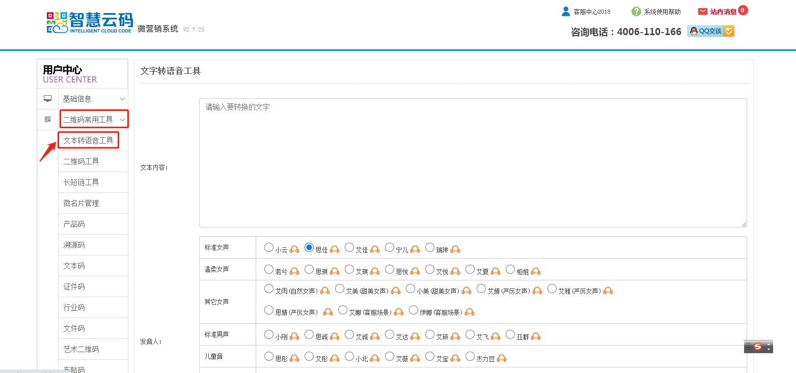 第一步:登錄智慧云碼系統后臺,找到左側第二個欄目點擊二維碼常用工具,找到文本轉語音工具;如下圖所示: