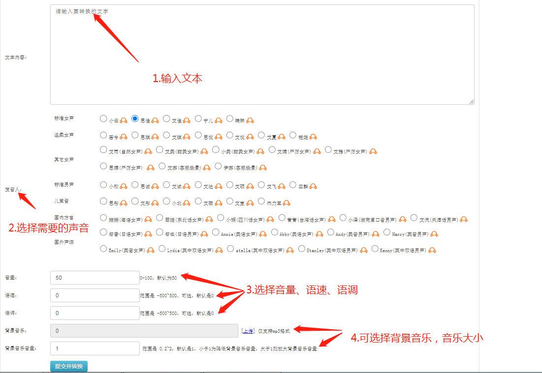 第二步:接下來是編輯頁面,“文本內容”里輸入文本;“發音人”可根據所需自行多樣化選擇即可;“音量”、“語速”、“語調”等均可按實際情況對應根據旁邊備注說明相應設置即可;“背景音樂”僅支持mp3格式;“背景音樂音量”范圍是 0.2~2,默認是1,小于1為降低背景音樂音量,大于1則放大背景音樂音量。可對應作為設置背景來調試音量大小。如下圖所示: