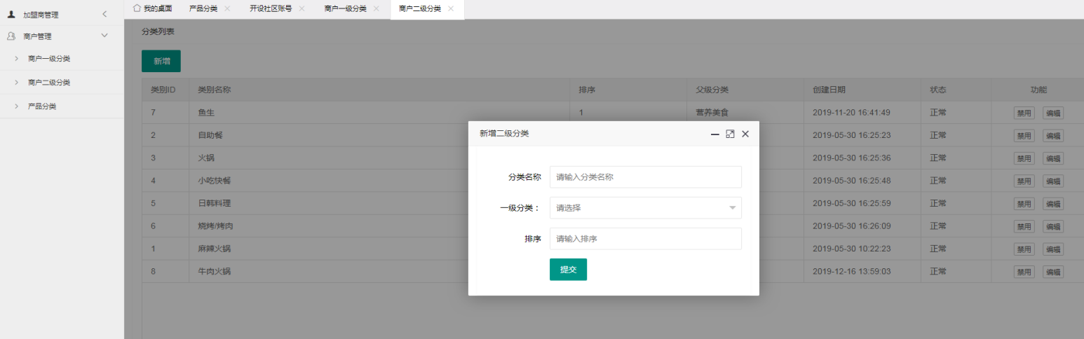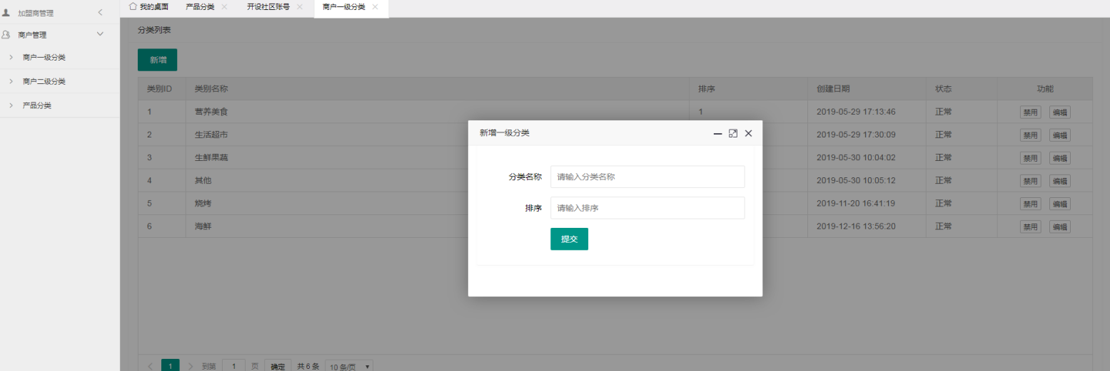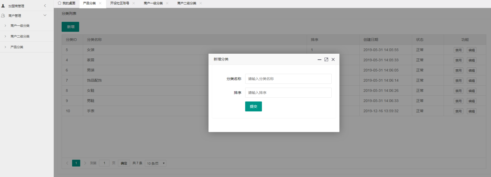 商戶管理分可設置商戶的一級分類和二級分類以及產品分類。