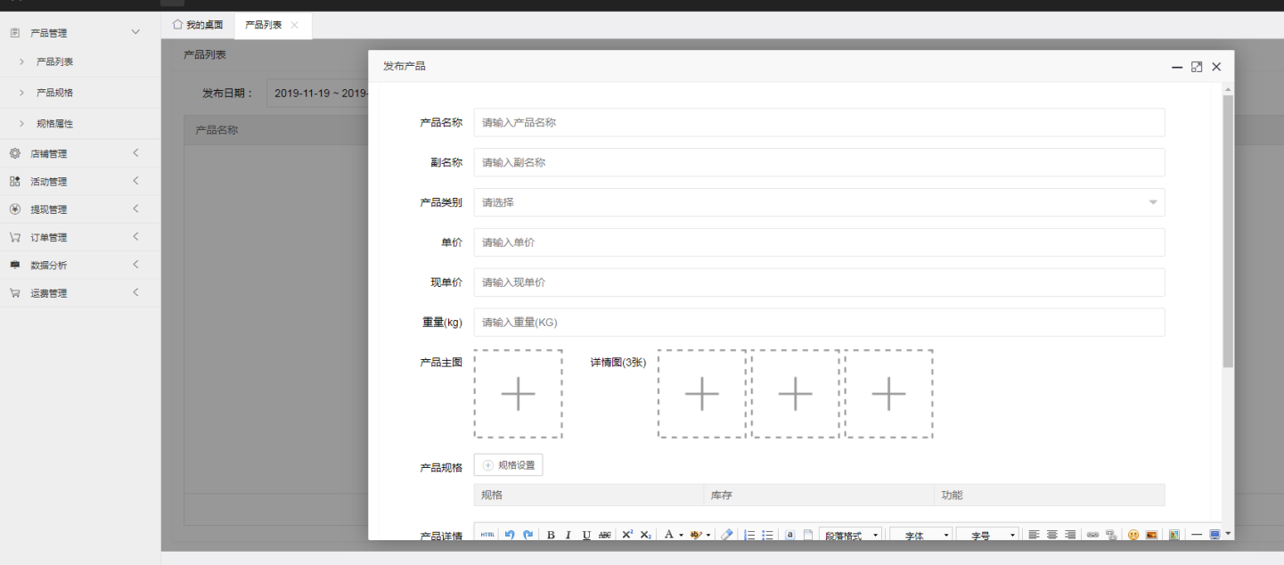 產品管理主要包括產品列表,產品規格,規格屬性。如下圖所示: