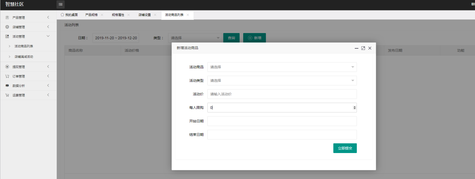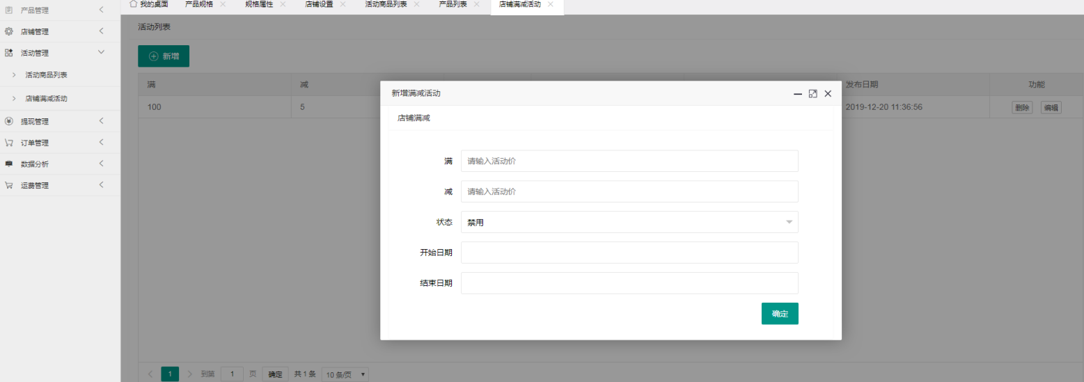 活動管理主要是包括活動商品列表和店鋪滿減活動。